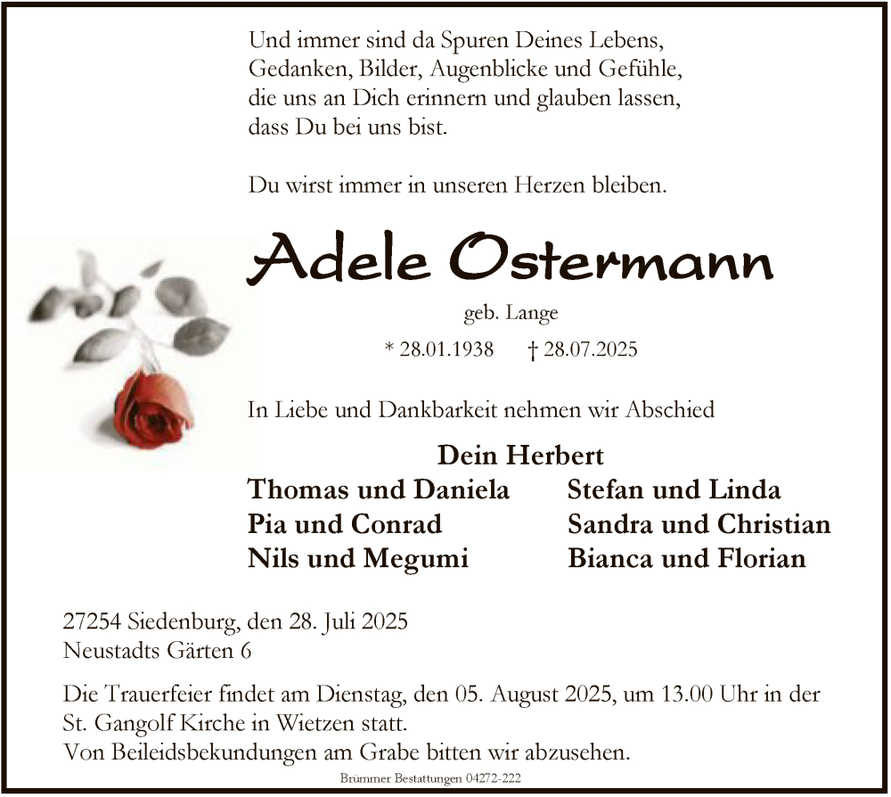 Hier finden Sie alle Traueranzeigen aus der Zeitung, die bisher für Adele Ostermann erschienen sind. Weitere Traueranzeigen, die in der Zeitung erscheinen, werden hier ebenfalls aufgelistet