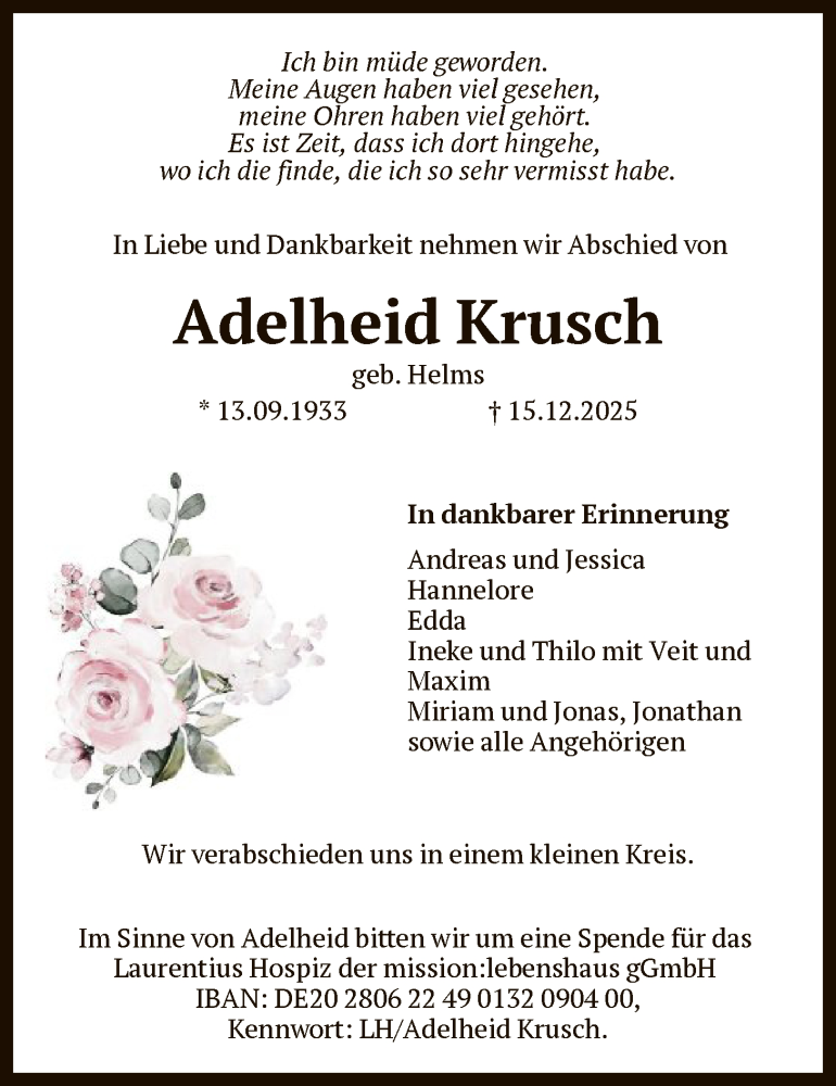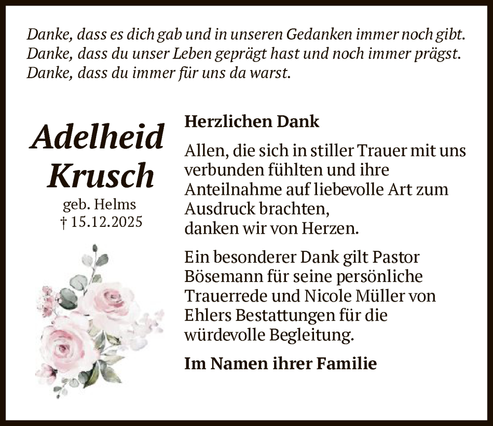 Hier finden Sie alle Traueranzeigen aus der Zeitung, die bisher für Adelheid Krusch erschienen sind. Weitere Traueranzeigen, die in der Zeitung erscheinen, werden hier ebenfalls aufgelistet