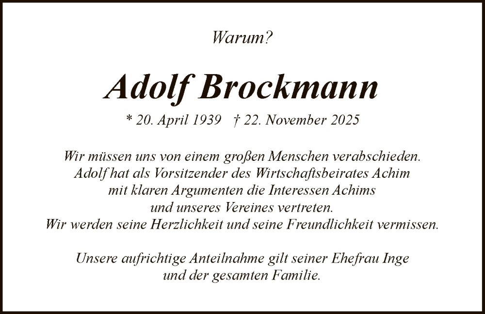 Hier finden Sie alle Traueranzeigen aus der Zeitung, die bisher für Adolf Brockmann erschienen sind. Weitere Traueranzeigen, die in der Zeitung erscheinen, werden hier ebenfalls aufgelistet
