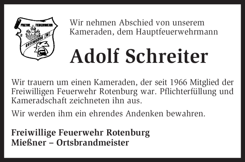 Hier finden Sie alle Traueranzeigen aus der Zeitung, die bisher für Adolf Schreiter erschienen sind. Weitere Traueranzeigen, die in der Zeitung erscheinen, werden hier ebenfalls aufgelistet