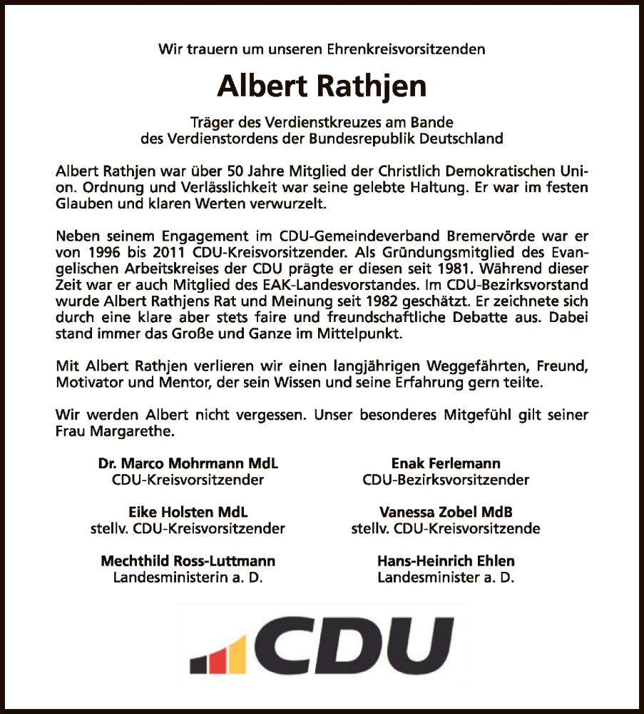 Hier finden Sie alle Traueranzeigen aus der Zeitung, die bisher für Albert Rathjen erschienen sind. Weitere Traueranzeigen, die in der Zeitung erscheinen, werden hier ebenfalls aufgelistet