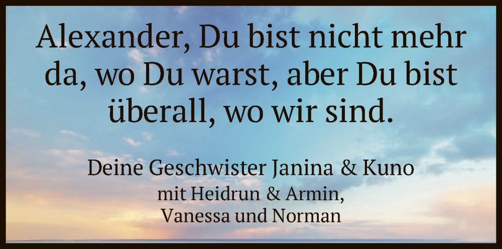 Hier finden Sie alle Traueranzeigen aus der Zeitung, die bisher für Alexander Kumpins erschienen sind. Weitere Traueranzeigen, die in der Zeitung erscheinen, werden hier ebenfalls aufgelistet