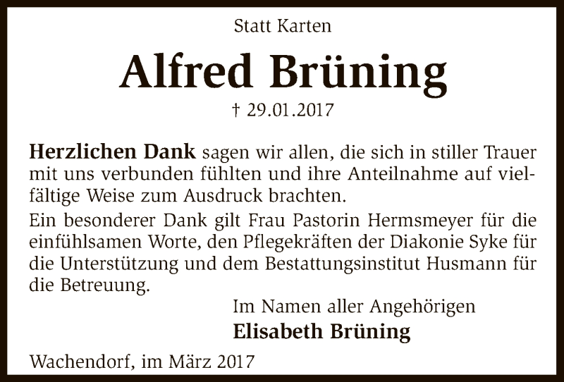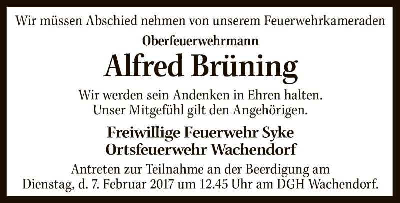 Hier finden Sie alle Traueranzeigen aus der Zeitung, die bisher für Alfred Brüning erschienen sind. Weitere Traueranzeigen, die in der Zeitung erscheinen, werden hier ebenfalls aufgelistet