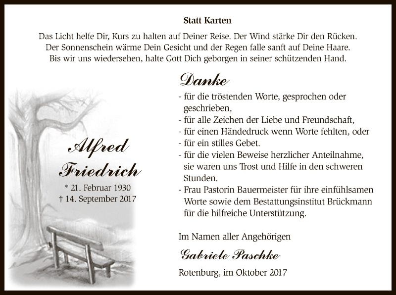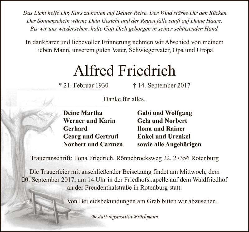 Hier finden Sie alle Traueranzeigen aus der Zeitung, die bisher für Alfred Friedrich erschienen sind. Weitere Traueranzeigen, die in der Zeitung erscheinen, werden hier ebenfalls aufgelistet