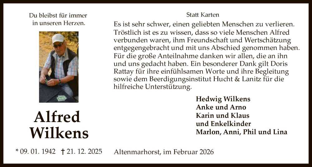 Hier finden Sie alle Traueranzeigen aus der Zeitung, die bisher für Alfred Wilkens erschienen sind. Weitere Traueranzeigen, die in der Zeitung erscheinen, werden hier ebenfalls aufgelistet