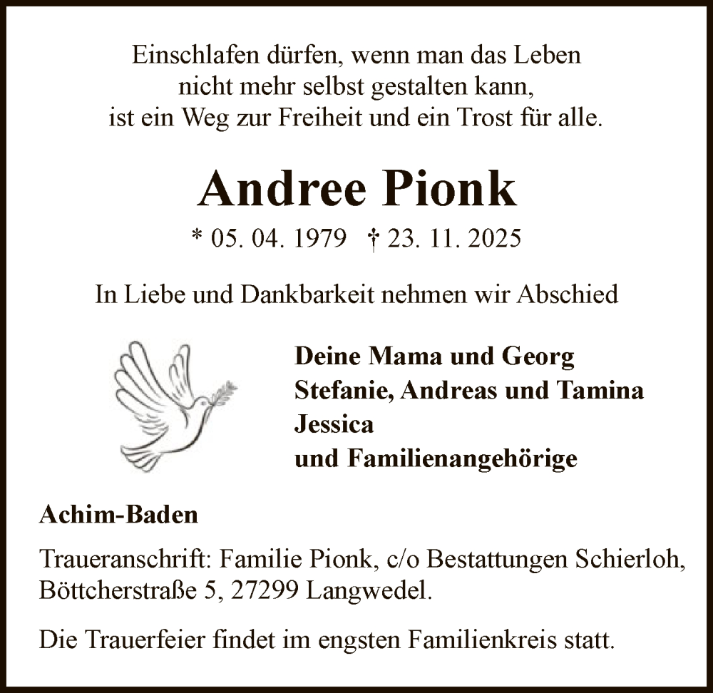 Hier finden Sie alle Traueranzeigen aus der Zeitung, die bisher für Andree Pionk erschienen sind. Weitere Traueranzeigen, die in der Zeitung erscheinen, werden hier ebenfalls aufgelistet