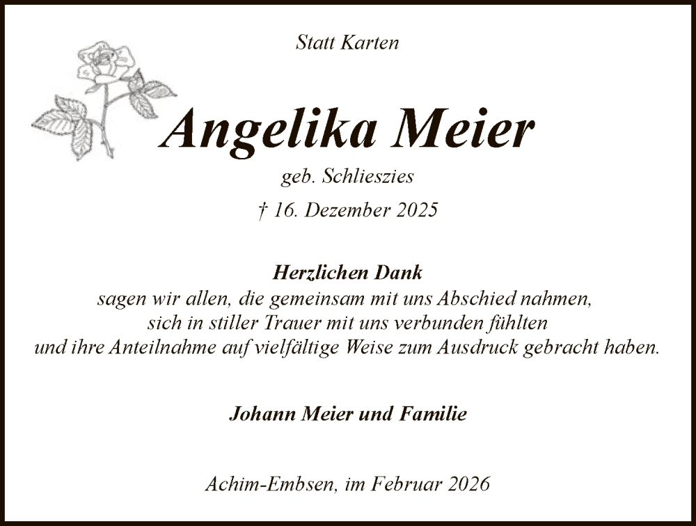 Hier finden Sie alle Traueranzeigen aus der Zeitung, die bisher für Angelika Meier erschienen sind. Weitere Traueranzeigen, die in der Zeitung erscheinen, werden hier ebenfalls aufgelistet