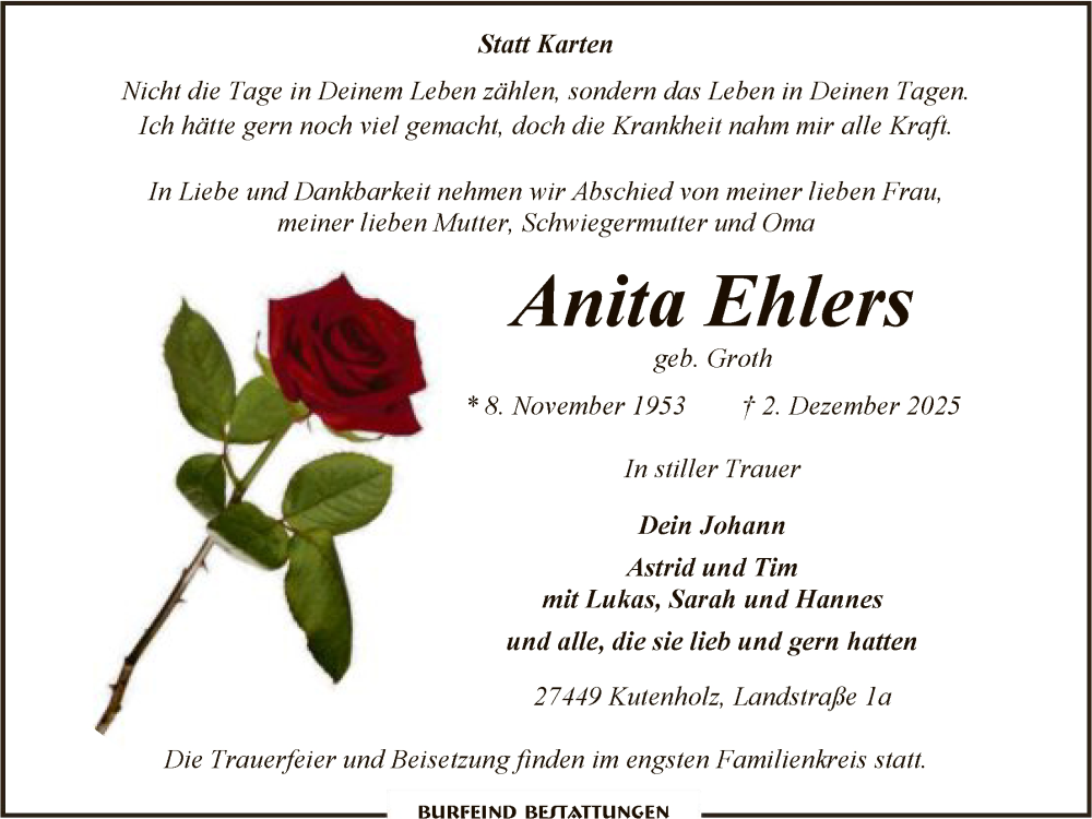 Hier finden Sie alle Traueranzeigen aus der Zeitung, die bisher für Anita Ehlers erschienen sind. Weitere Traueranzeigen, die in der Zeitung erscheinen, werden hier ebenfalls aufgelistet