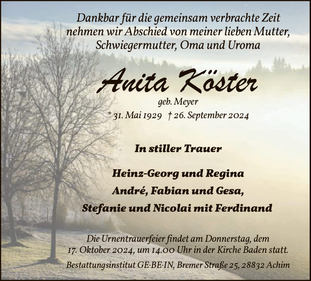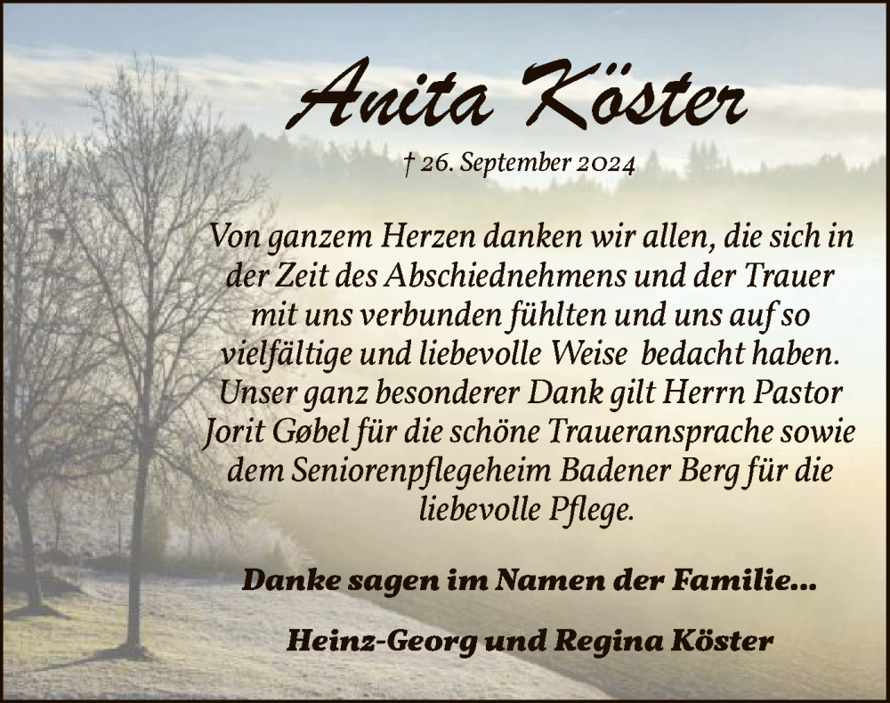 Hier finden Sie alle Traueranzeigen aus der Zeitung, die bisher für Anita Köster erschienen sind. Weitere Traueranzeigen, die in der Zeitung erscheinen, werden hier ebenfalls aufgelistet