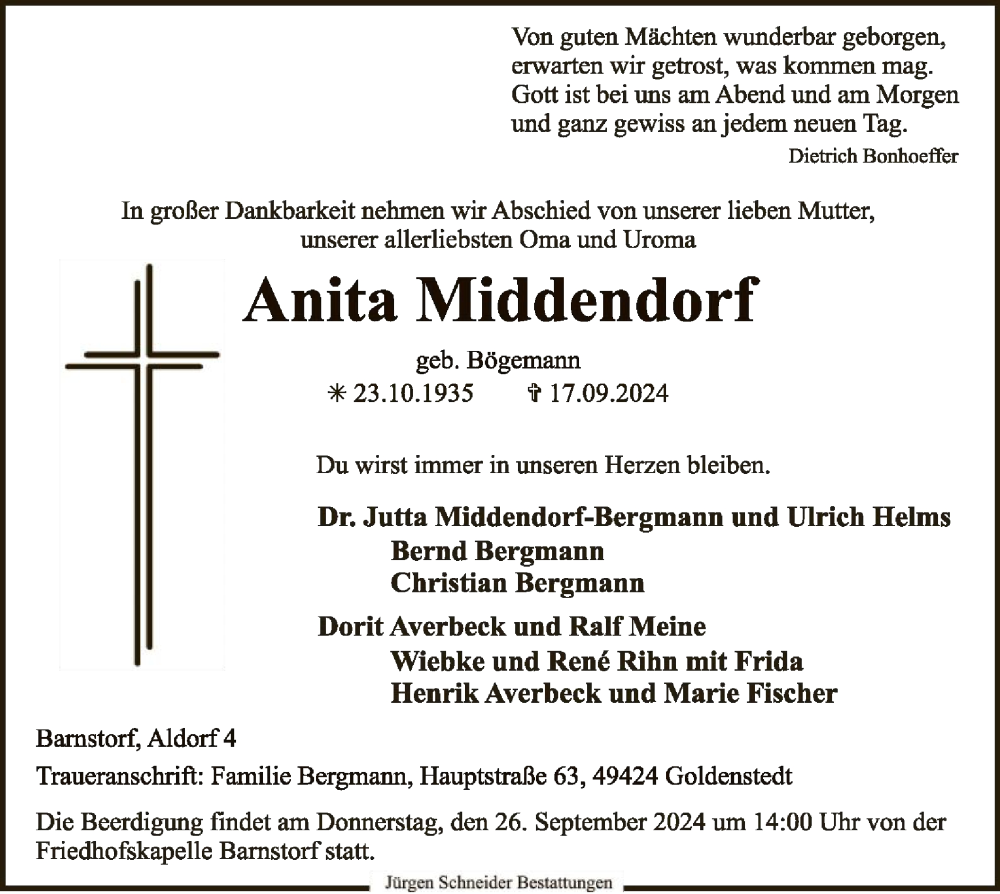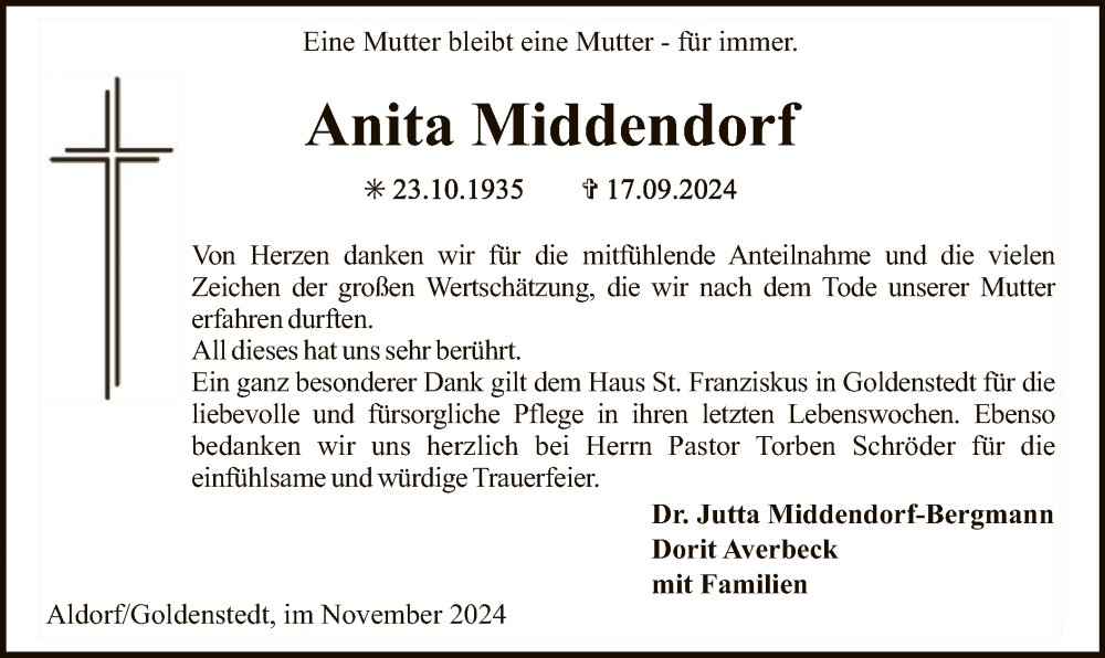 Hier finden Sie alle Traueranzeigen aus der Zeitung, die bisher für Anita Middendorf erschienen sind. Weitere Traueranzeigen, die in der Zeitung erscheinen, werden hier ebenfalls aufgelistet