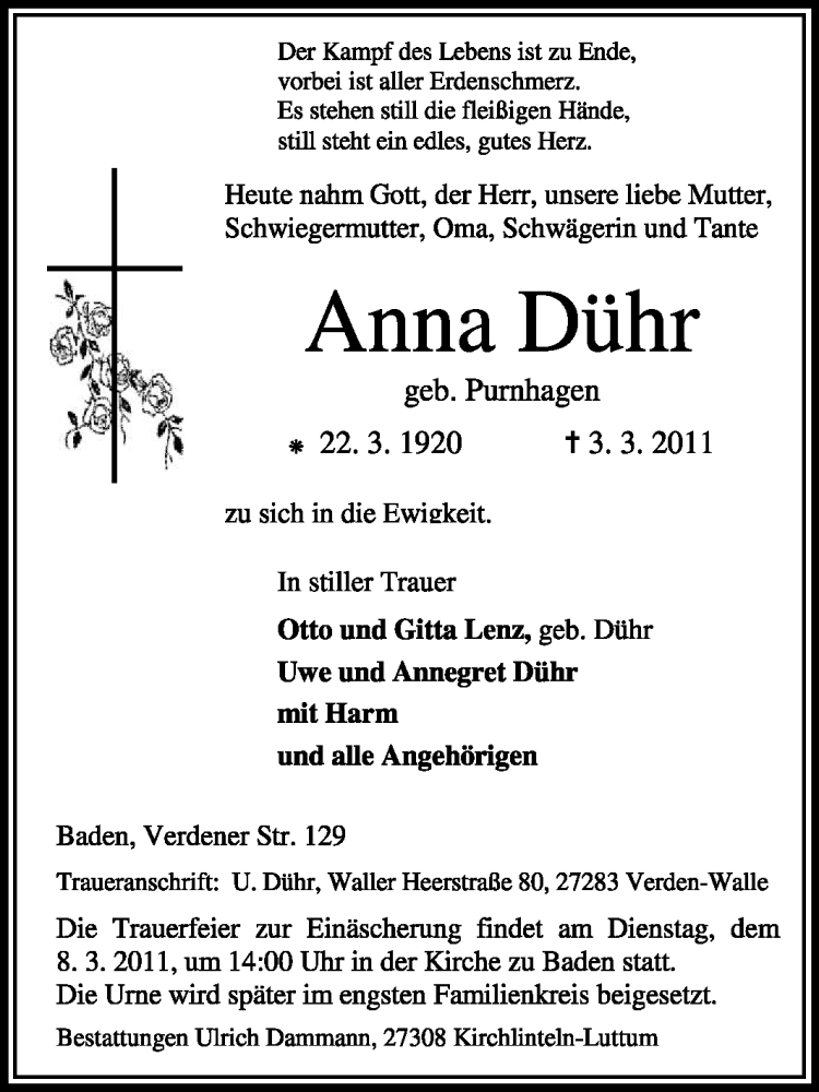 Hier finden Sie alle Traueranzeigen aus der Zeitung, die bisher für Anna Dühr erschienen sind. Weitere Traueranzeigen, die in der Zeitung erscheinen, werden hier ebenfalls aufgelistet