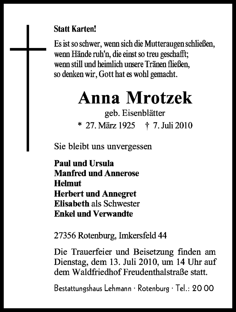 Hier finden Sie alle Traueranzeigen aus der Zeitung, die bisher für Anna Mrotzek erschienen sind. Weitere Traueranzeigen, die in der Zeitung erscheinen, werden hier ebenfalls aufgelistet