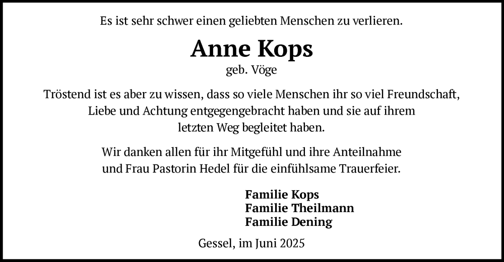 Hier finden Sie alle Traueranzeigen aus der Zeitung, die bisher für Anne Kops erschienen sind. Weitere Traueranzeigen, die in der Zeitung erscheinen, werden hier ebenfalls aufgelistet