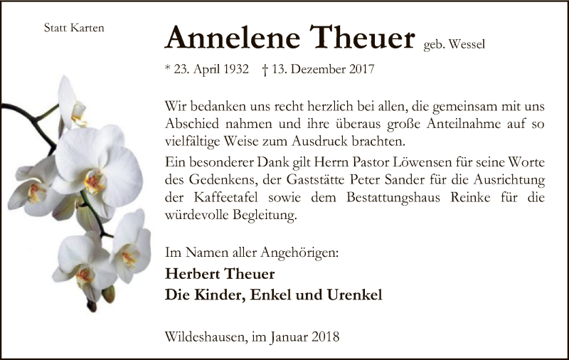 Hier finden Sie alle Traueranzeigen aus der Zeitung, die bisher für Annelene Theuer erschienen sind. Weitere Traueranzeigen, die in der Zeitung erscheinen, werden hier ebenfalls aufgelistet