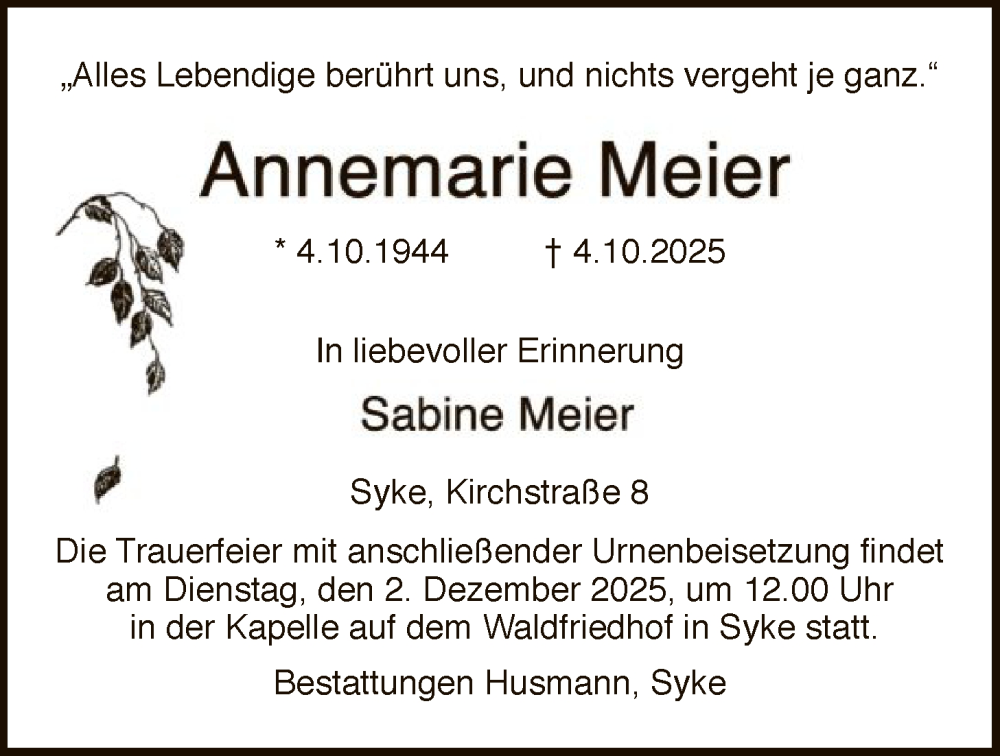 Hier finden Sie alle Traueranzeigen aus der Zeitung, die bisher für Annemarie Meier erschienen sind. Weitere Traueranzeigen, die in der Zeitung erscheinen, werden hier ebenfalls aufgelistet