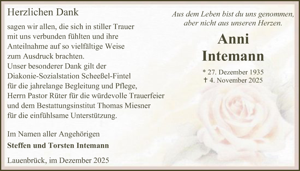 Hier finden Sie alle Traueranzeigen aus der Zeitung, die bisher für Anni Intemann erschienen sind. Weitere Traueranzeigen, die in der Zeitung erscheinen, werden hier ebenfalls aufgelistet