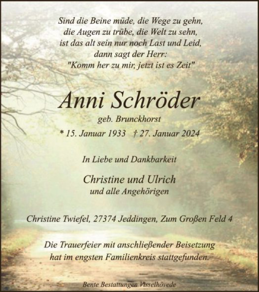 Hier finden Sie alle Traueranzeigen aus der Zeitung, die bisher für Anni Schröder erschienen sind. Weitere Traueranzeigen, die in der Zeitung erscheinen, werden hier ebenfalls aufgelistet