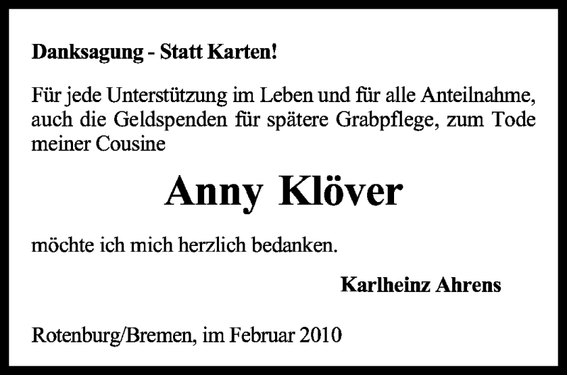 Hier finden Sie alle Traueranzeigen aus der Zeitung, die bisher für Anny Klöver erschienen sind. Weitere Traueranzeigen, die in der Zeitung erscheinen, werden hier ebenfalls aufgelistet
