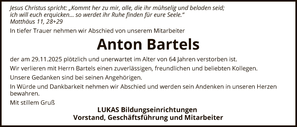 Hier finden Sie alle Traueranzeigen aus der Zeitung, die bisher für Anton Bartels erschienen sind. Weitere Traueranzeigen, die in der Zeitung erscheinen, werden hier ebenfalls aufgelistet