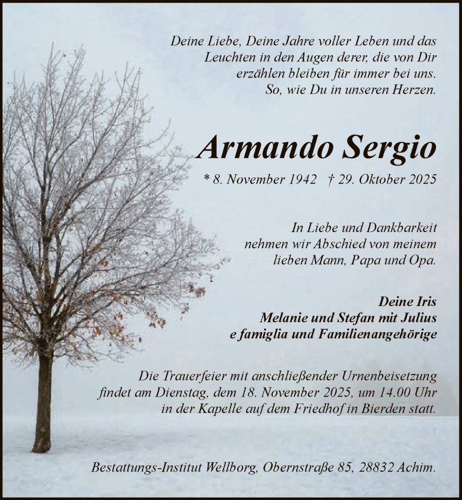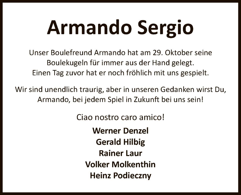 Hier finden Sie alle Traueranzeigen aus der Zeitung, die bisher für Armando Sergio erschienen sind. Weitere Traueranzeigen, die in der Zeitung erscheinen, werden hier ebenfalls aufgelistet