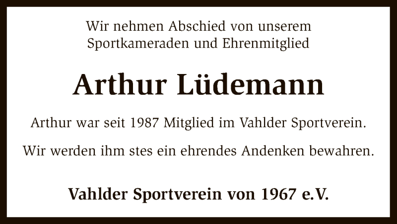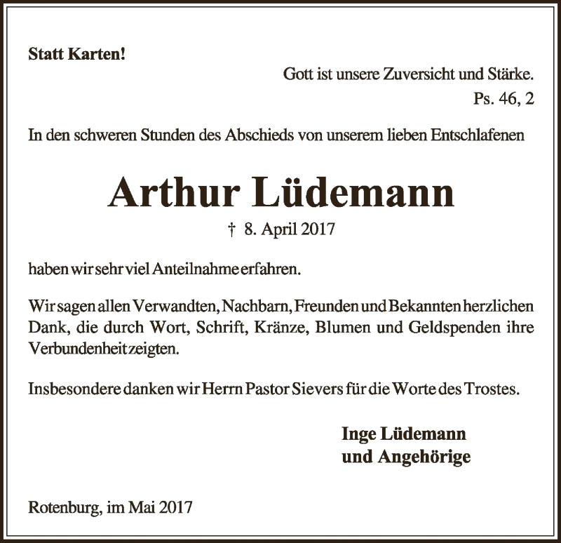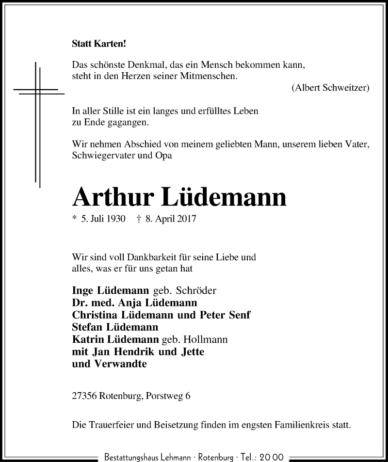 Hier finden Sie alle Traueranzeigen aus der Zeitung, die bisher für Arthur Lüdemann erschienen sind. Weitere Traueranzeigen, die in der Zeitung erscheinen, werden hier ebenfalls aufgelistet