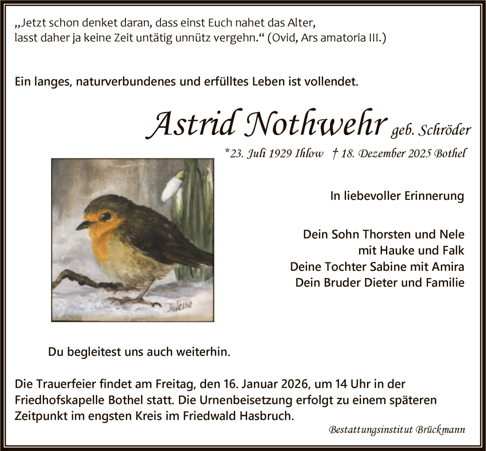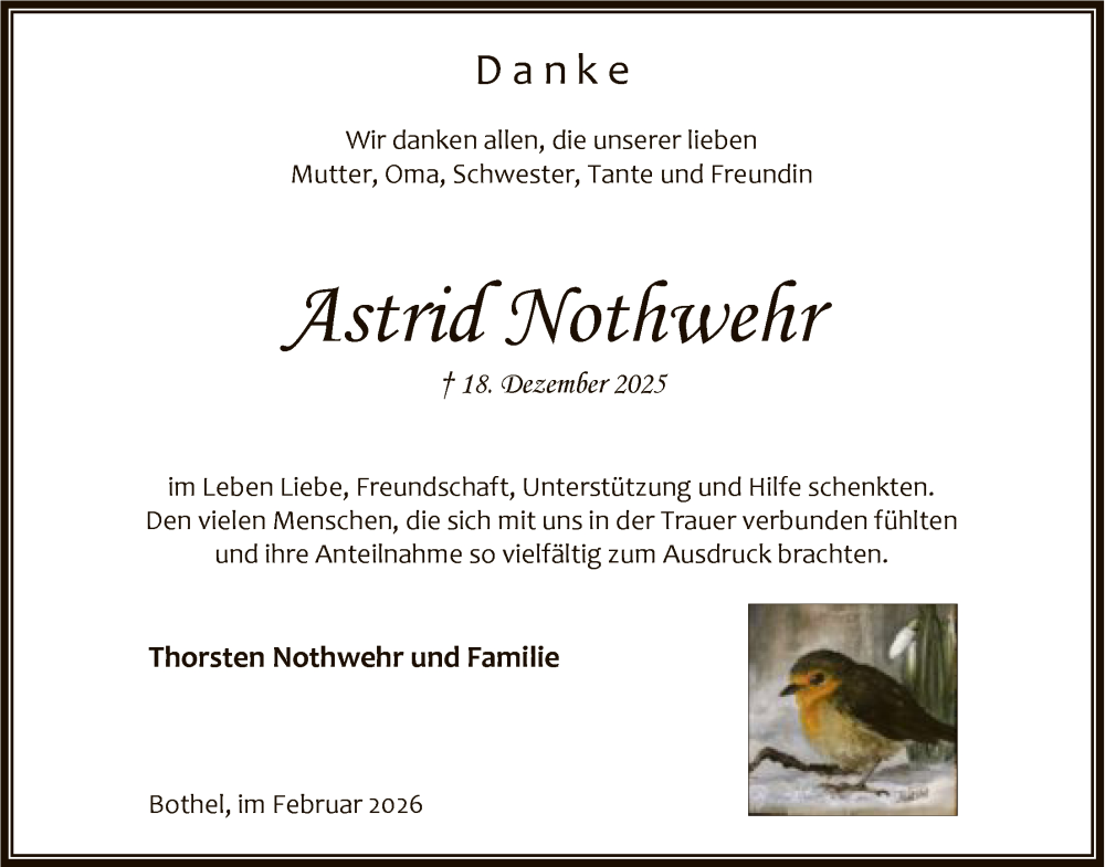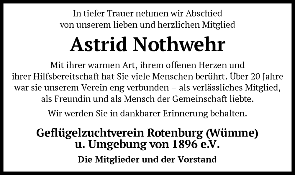Hier finden Sie alle Traueranzeigen aus der Zeitung, die bisher für Astrid Nothwehr erschienen sind. Weitere Traueranzeigen, die in der Zeitung erscheinen, werden hier ebenfalls aufgelistet