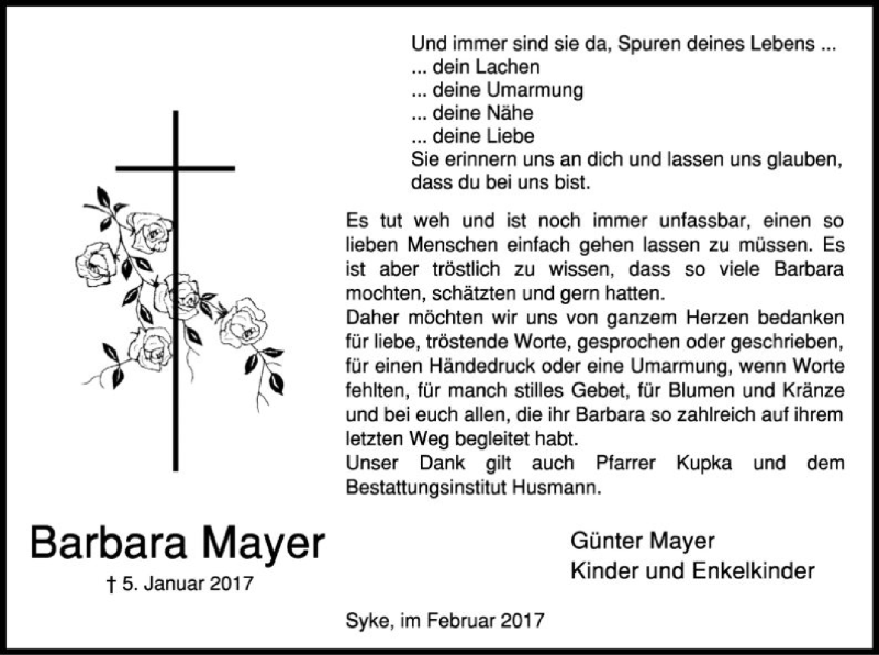 Hier finden Sie alle Traueranzeigen aus der Zeitung, die bisher für Barbara Mayer erschienen sind. Weitere Traueranzeigen, die in der Zeitung erscheinen, werden hier ebenfalls aufgelistet