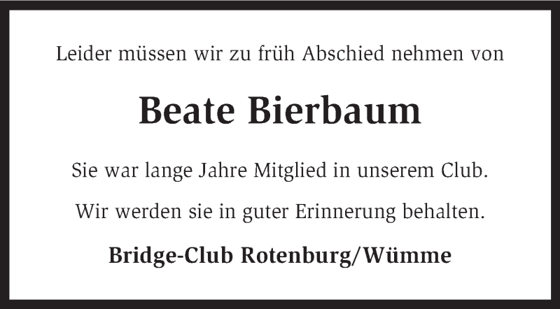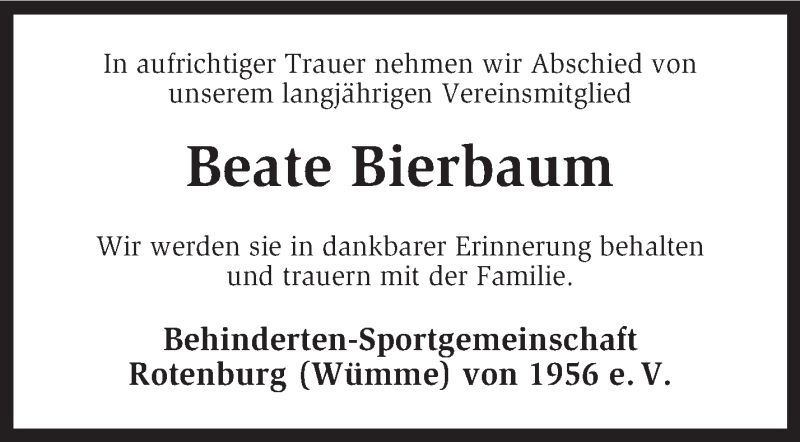 Hier finden Sie alle Traueranzeigen aus der Zeitung, die bisher für Beate Bierbaum erschienen sind. Weitere Traueranzeigen, die in der Zeitung erscheinen, werden hier ebenfalls aufgelistet