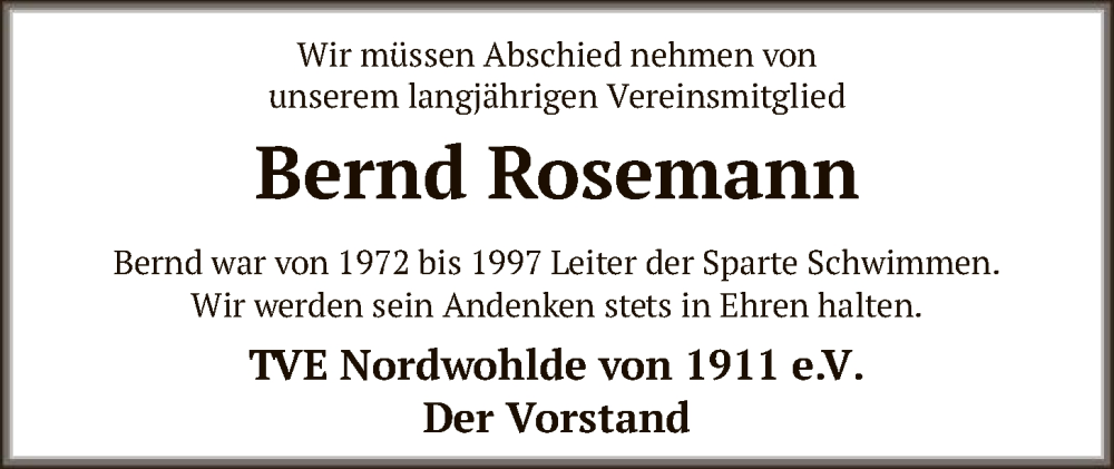 Hier finden Sie alle Traueranzeigen aus der Zeitung, die bisher für Bernd Rosemann erschienen sind. Weitere Traueranzeigen, die in der Zeitung erscheinen, werden hier ebenfalls aufgelistet