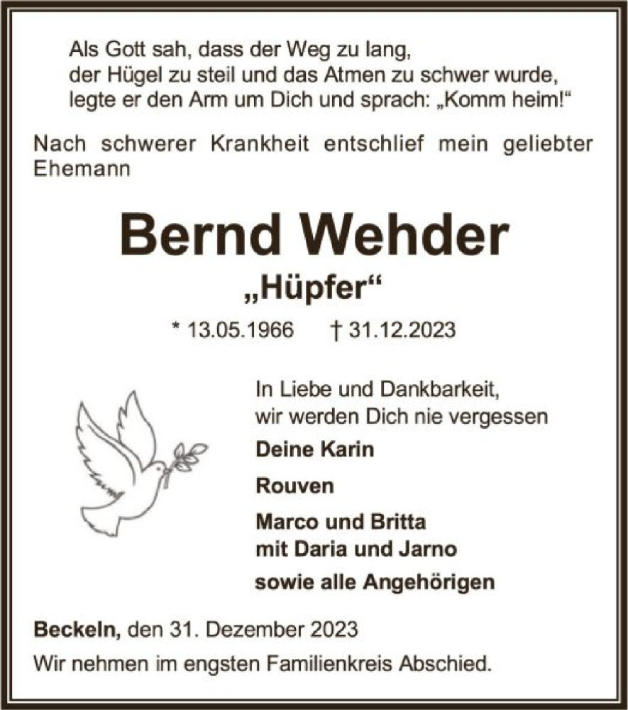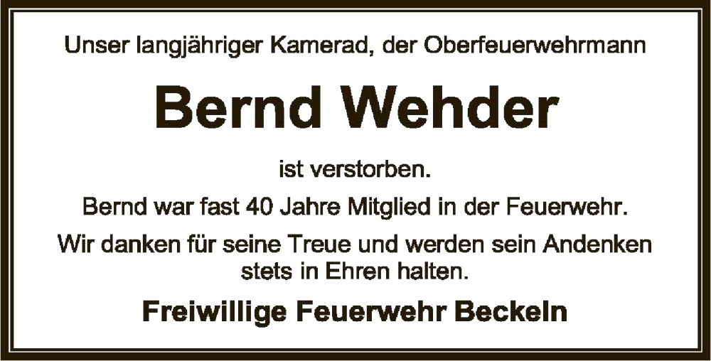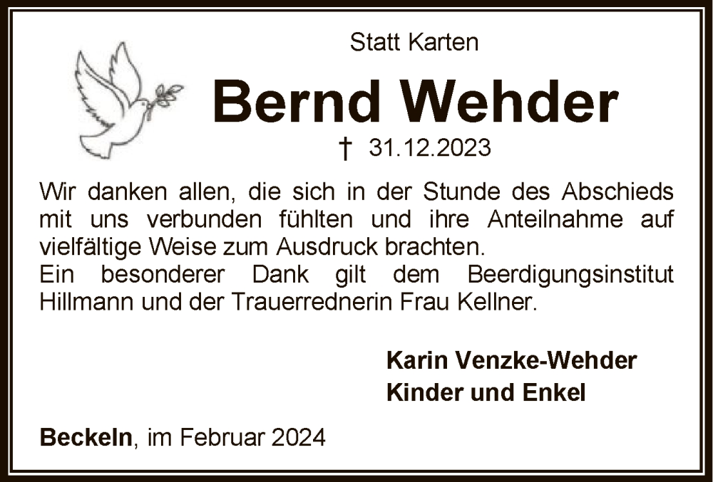 Hier finden Sie alle Traueranzeigen aus der Zeitung, die bisher für Bernd Wehder erschienen sind. Weitere Traueranzeigen, die in der Zeitung erscheinen, werden hier ebenfalls aufgelistet