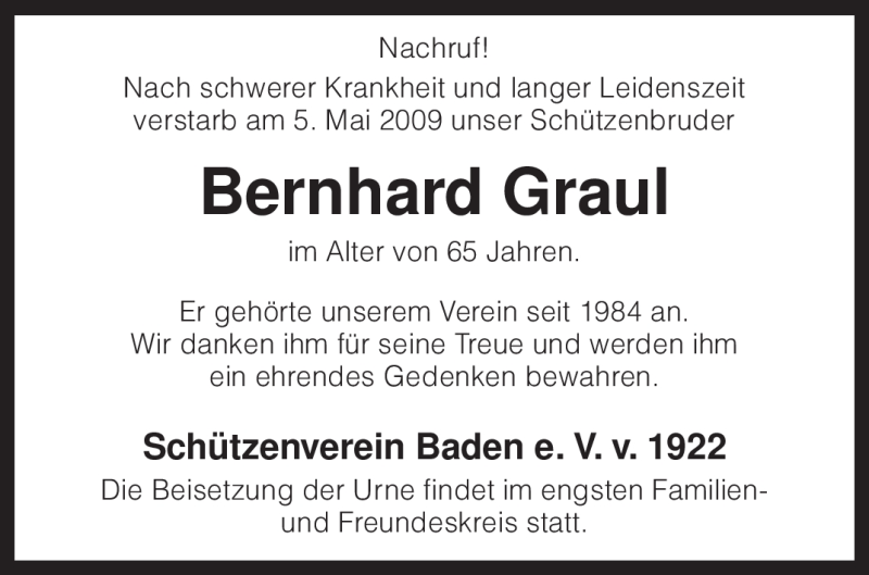 Hier finden Sie alle Traueranzeigen aus der Zeitung, die bisher für Bernhard Graul erschienen sind. Weitere Traueranzeigen, die in der Zeitung erscheinen, werden hier ebenfalls aufgelistet