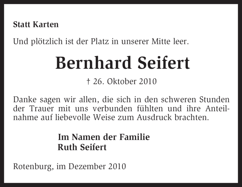 Hier finden Sie alle Traueranzeigen aus der Zeitung, die bisher für Bernhard Seifert erschienen sind. Weitere Traueranzeigen, die in der Zeitung erscheinen, werden hier ebenfalls aufgelistet