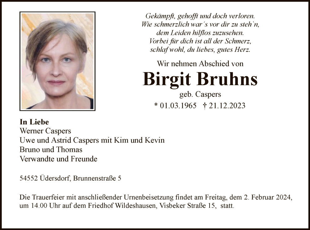 Hier finden Sie alle Traueranzeigen aus der Zeitung, die bisher für Birgit Bruhns erschienen sind. Weitere Traueranzeigen, die in der Zeitung erscheinen, werden hier ebenfalls aufgelistet