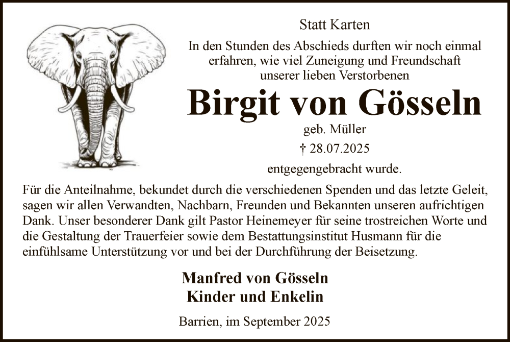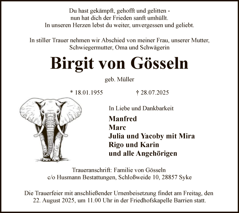 Hier finden Sie alle Traueranzeigen aus der Zeitung, die bisher für Birgit von Gösseln erschienen sind. Weitere Traueranzeigen, die in der Zeitung erscheinen, werden hier ebenfalls aufgelistet