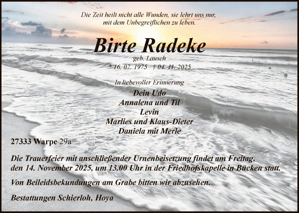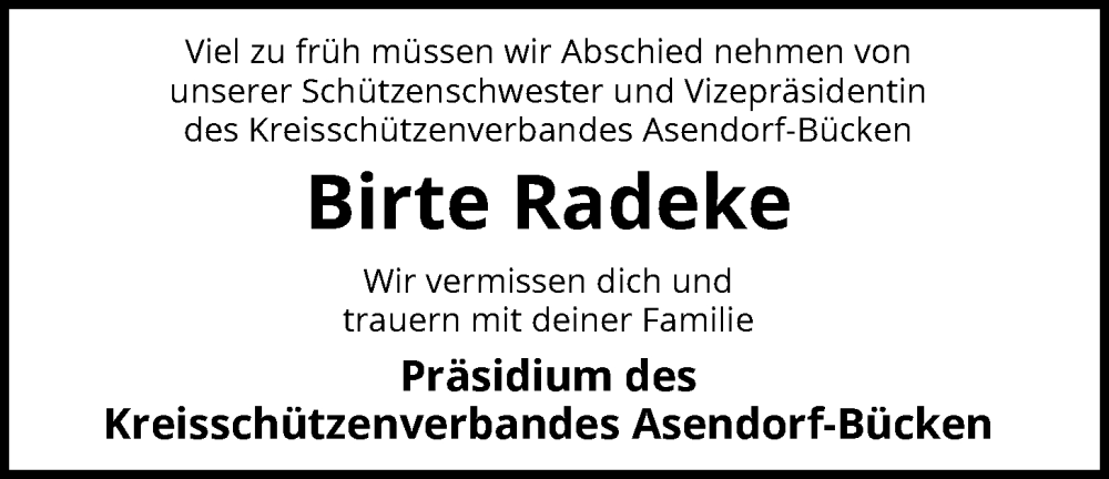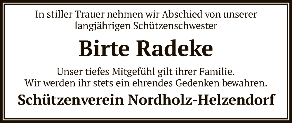 Hier finden Sie alle Traueranzeigen aus der Zeitung, die bisher für Birte Radeke erschienen sind. Weitere Traueranzeigen, die in der Zeitung erscheinen, werden hier ebenfalls aufgelistet
