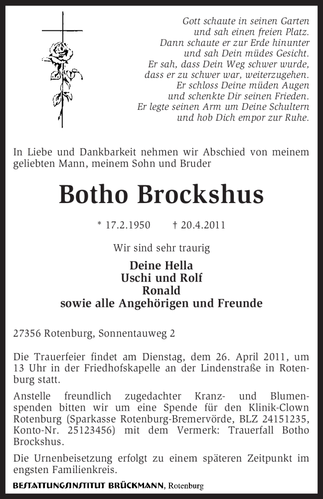 Hier finden Sie alle Traueranzeigen aus der Zeitung, die bisher für Botho Brockshus erschienen sind. Weitere Traueranzeigen, die in der Zeitung erscheinen, werden hier ebenfalls aufgelistet