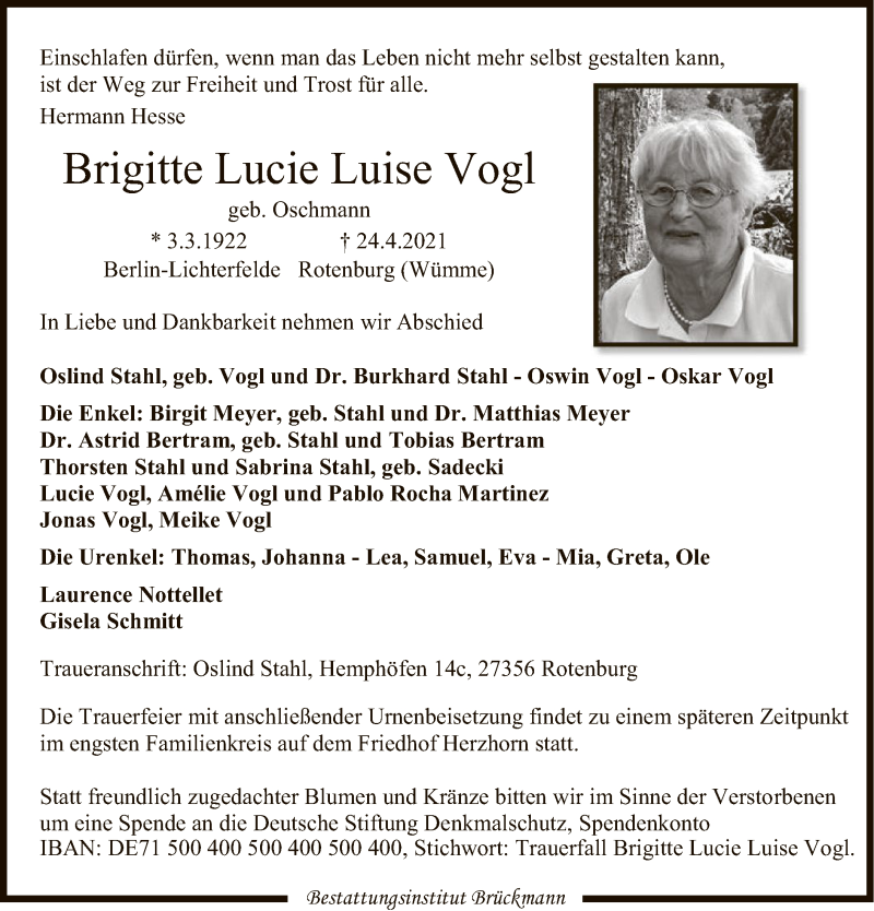 Hier finden Sie alle Traueranzeigen aus der Zeitung, die bisher für Brigitte Lucie Luise Vogl erschienen sind. Weitere Traueranzeigen, die in der Zeitung erscheinen, werden hier ebenfalls aufgelistet