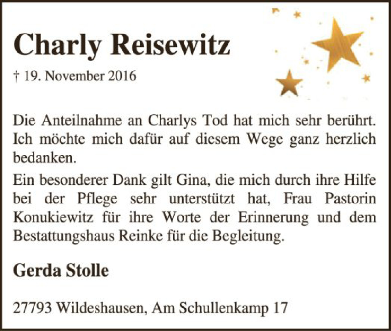 Hier finden Sie alle Traueranzeigen aus der Zeitung, die bisher für Charly Reisewitz erschienen sind. Weitere Traueranzeigen, die in der Zeitung erscheinen, werden hier ebenfalls aufgelistet