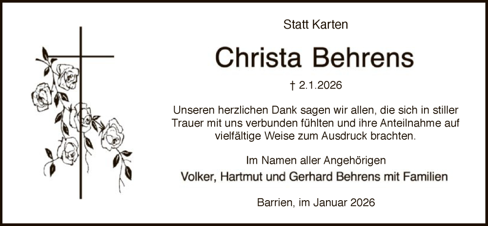 Hier finden Sie alle Traueranzeigen aus der Zeitung, die bisher für Christa Behrens erschienen sind. Weitere Traueranzeigen, die in der Zeitung erscheinen, werden hier ebenfalls aufgelistet