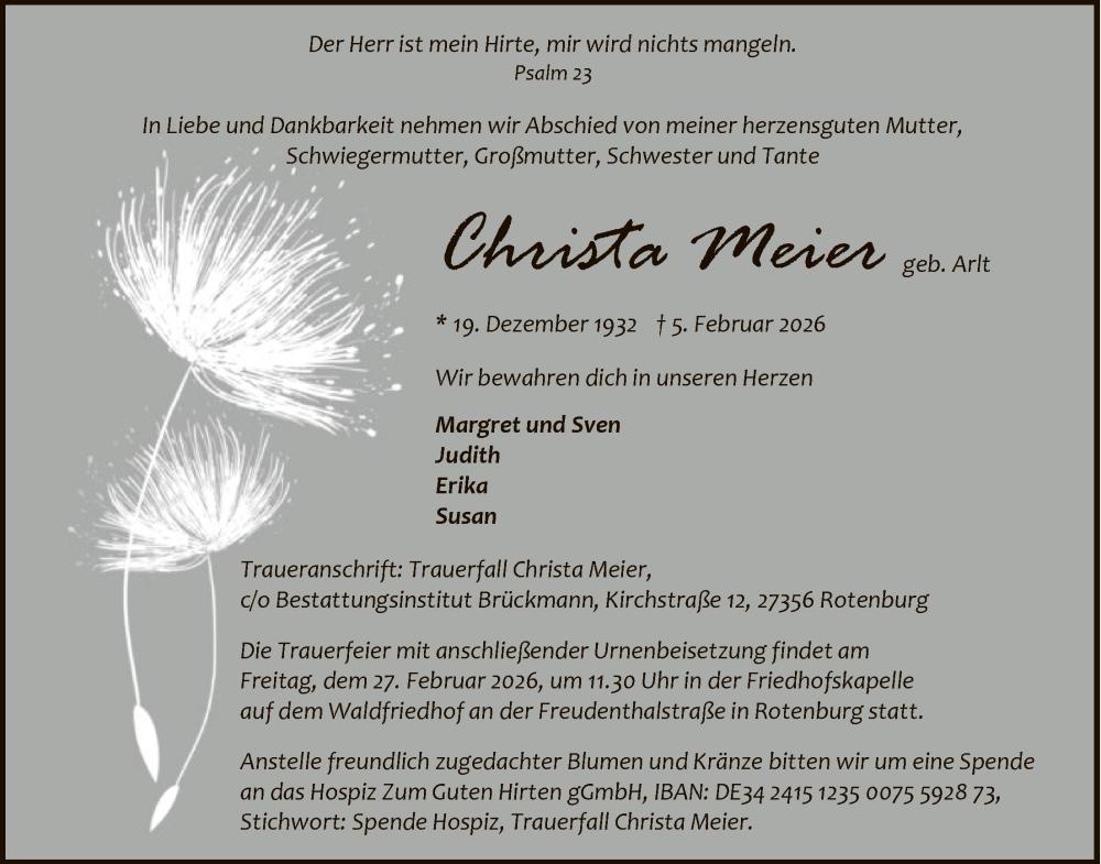 Hier finden Sie alle Traueranzeigen aus der Zeitung, die bisher für Christa Meier erschienen sind. Weitere Traueranzeigen, die in der Zeitung erscheinen, werden hier ebenfalls aufgelistet