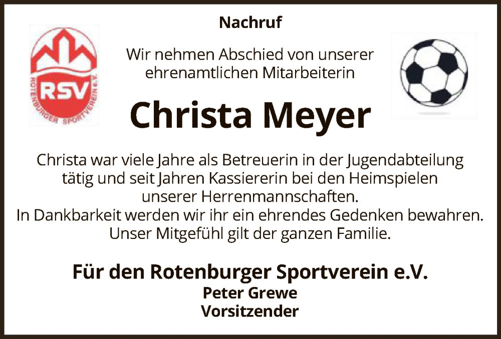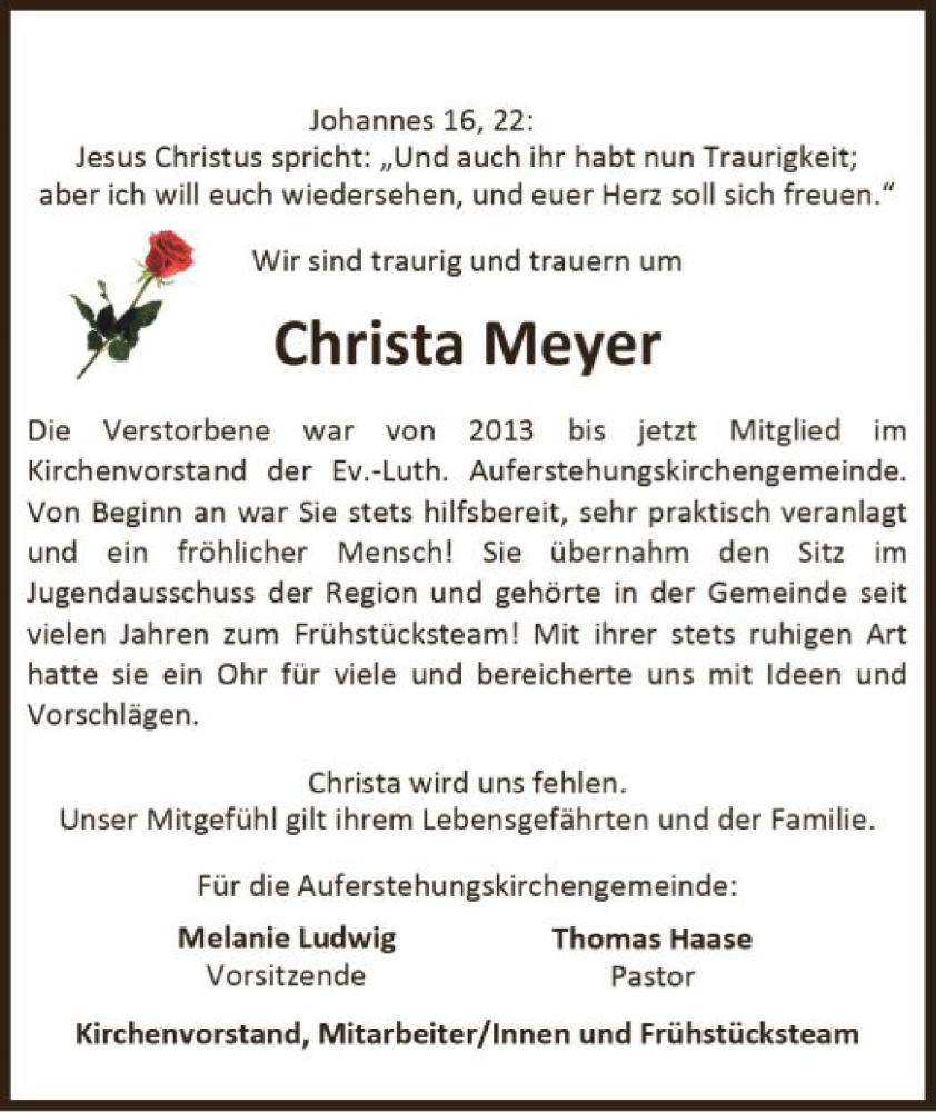 Hier finden Sie alle Traueranzeigen aus der Zeitung, die bisher für Christa Meyer erschienen sind. Weitere Traueranzeigen, die in der Zeitung erscheinen, werden hier ebenfalls aufgelistet