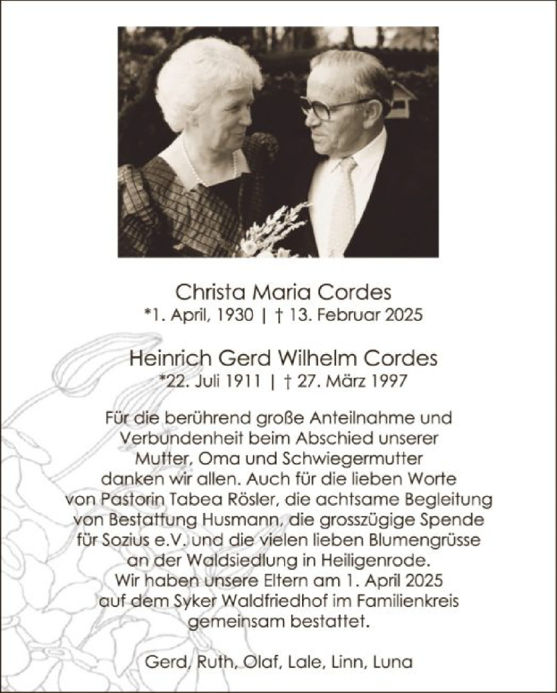 Hier finden Sie alle Traueranzeigen aus der Zeitung, die bisher für Christa und Heinrich Cordes erschienen sind. Weitere Traueranzeigen, die in der Zeitung erscheinen, werden hier ebenfalls aufgelistet