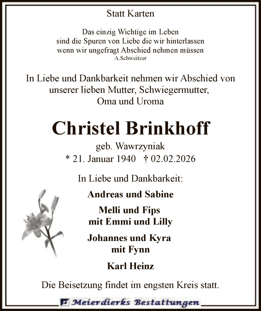 Hier finden Sie alle Traueranzeigen aus der Zeitung, die bisher für Christel Brinkhoff erschienen sind. Weitere Traueranzeigen, die in der Zeitung erscheinen, werden hier ebenfalls aufgelistet