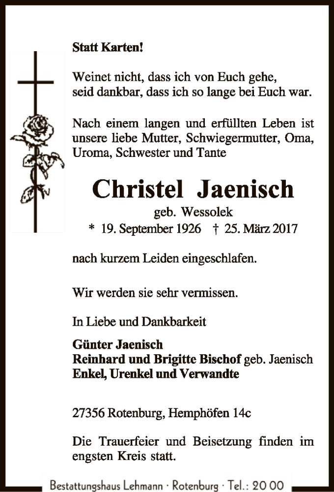 Hier finden Sie alle Traueranzeigen aus der Zeitung, die bisher für Christel Jaenisch erschienen sind. Weitere Traueranzeigen, die in der Zeitung erscheinen, werden hier ebenfalls aufgelistet
