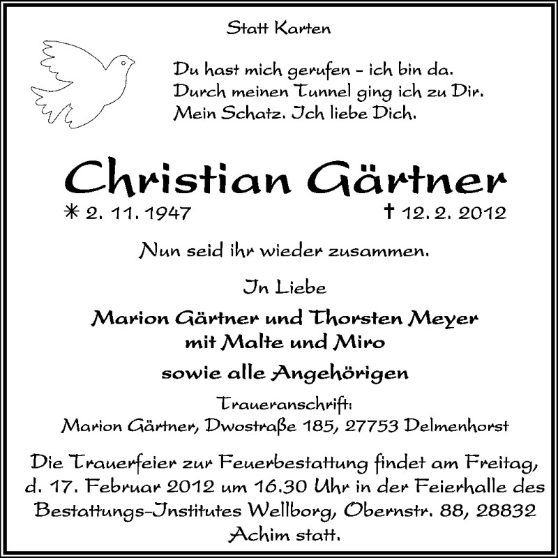 Hier finden Sie alle Traueranzeigen aus der Zeitung, die bisher für Christian Gärtner erschienen sind. Weitere Traueranzeigen, die in der Zeitung erscheinen, werden hier ebenfalls aufgelistet