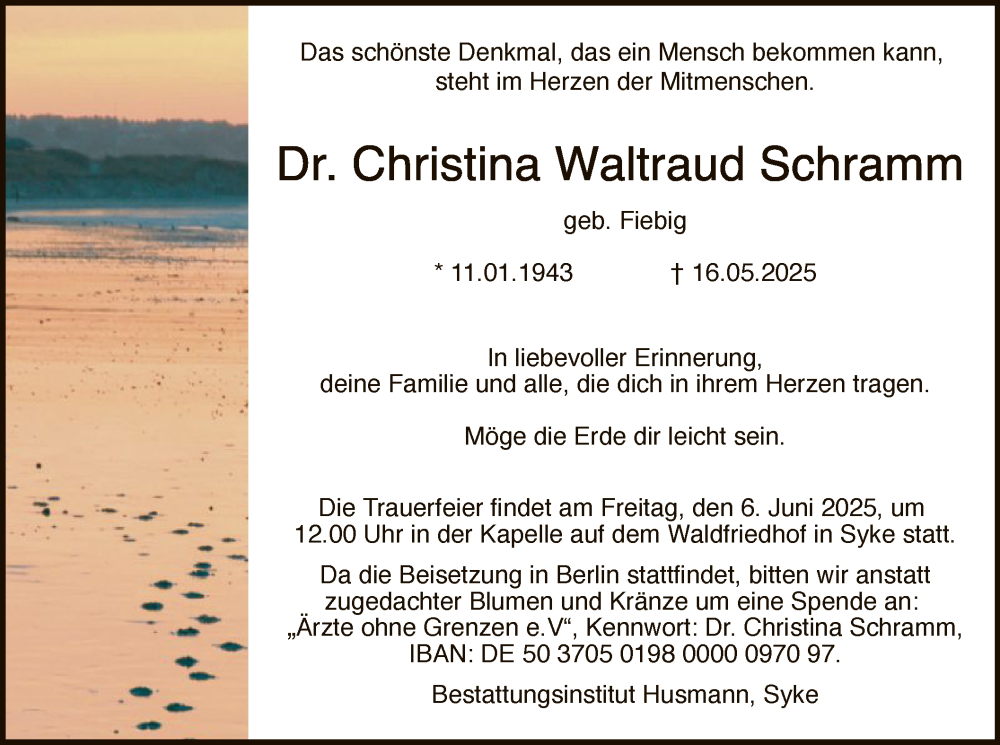 Hier finden Sie alle Traueranzeigen aus der Zeitung, die bisher für Christina Waltraud Schramm erschienen sind. Weitere Traueranzeigen, die in der Zeitung erscheinen, werden hier ebenfalls aufgelistet