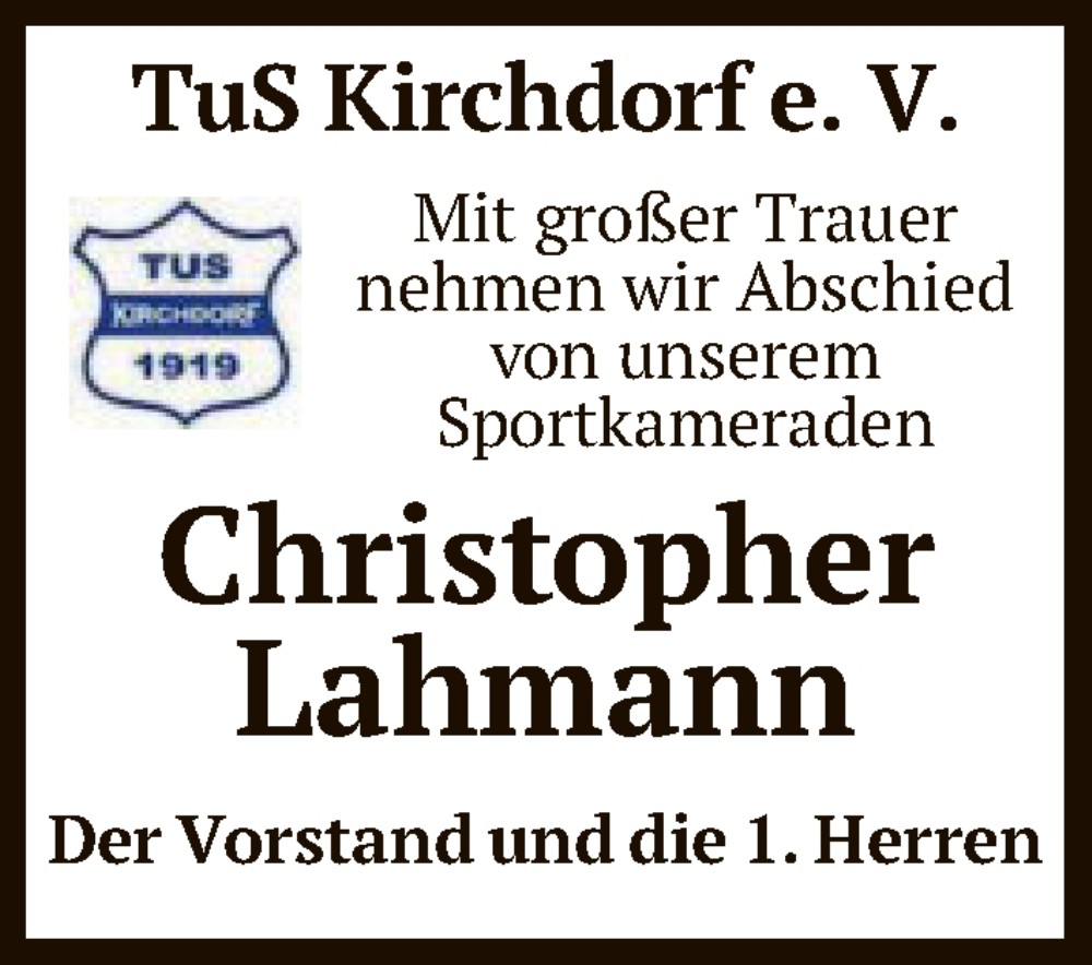 Hier finden Sie alle Traueranzeigen aus der Zeitung, die bisher für Christopher Lahmann erschienen sind. Weitere Traueranzeigen, die in der Zeitung erscheinen, werden hier ebenfalls aufgelistet