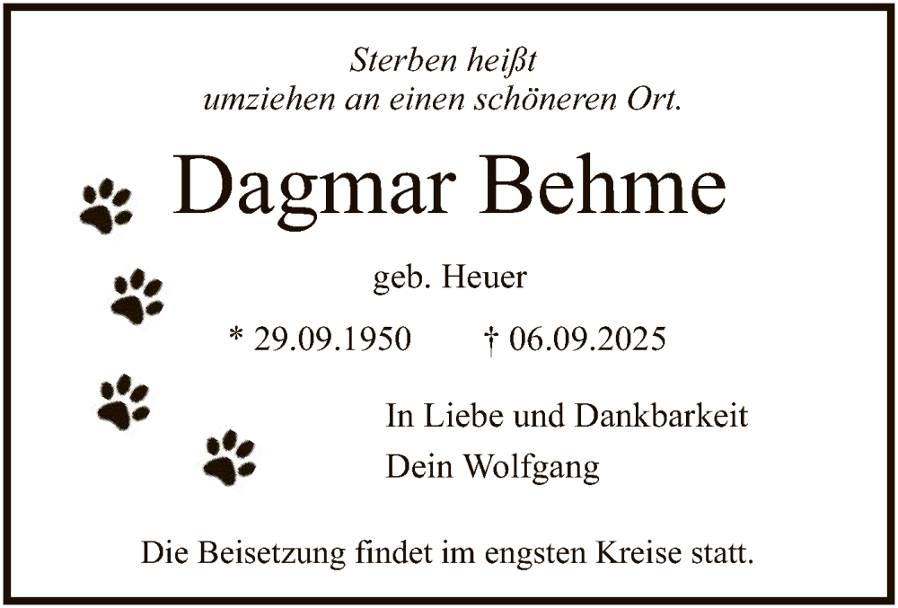 Hier finden Sie alle Traueranzeigen aus der Zeitung, die bisher für Dagmar Behme erschienen sind. Weitere Traueranzeigen, die in der Zeitung erscheinen, werden hier ebenfalls aufgelistet