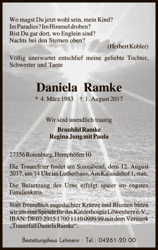 Hier finden Sie alle Traueranzeigen aus der Zeitung, die bisher für Daniela Ranike erschienen sind. Weitere Traueranzeigen, die in der Zeitung erscheinen, werden hier ebenfalls aufgelistet