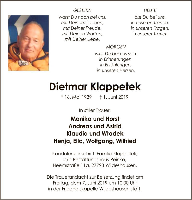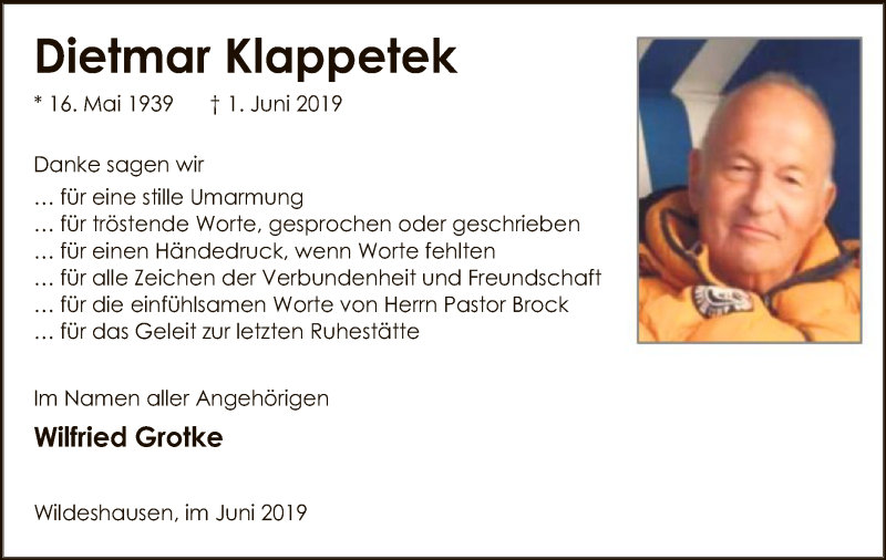 Hier finden Sie alle Traueranzeigen aus der Zeitung, die bisher für Dietmar Klappetek erschienen sind. Weitere Traueranzeigen, die in der Zeitung erscheinen, werden hier ebenfalls aufgelistet